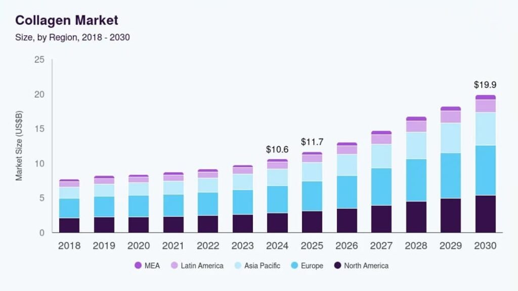 The Global Collagen Market size was estimated at USD 9.9 billion in 2024 and is projected to reach USD 18.7 billion by 2030, growing at a CAGR of 11.3% from 2025 to 2030.