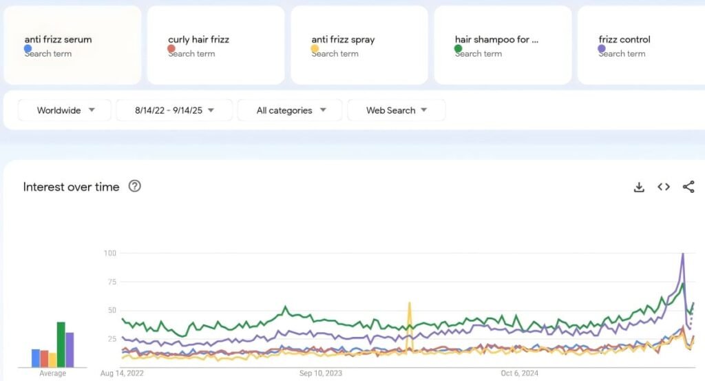 Search demand clusters around “frizz control serum,” “humidity hair spray,” and “anti-static hair mist.” Social proof thrives on #FrizzFreeHair, #SmoothHairRoutine, #SlickBun. Consumers want non-greasy textures, curl-safe claims, and all-day smoothness, opening niches in travel mists, night serums, and hot-climate shields.