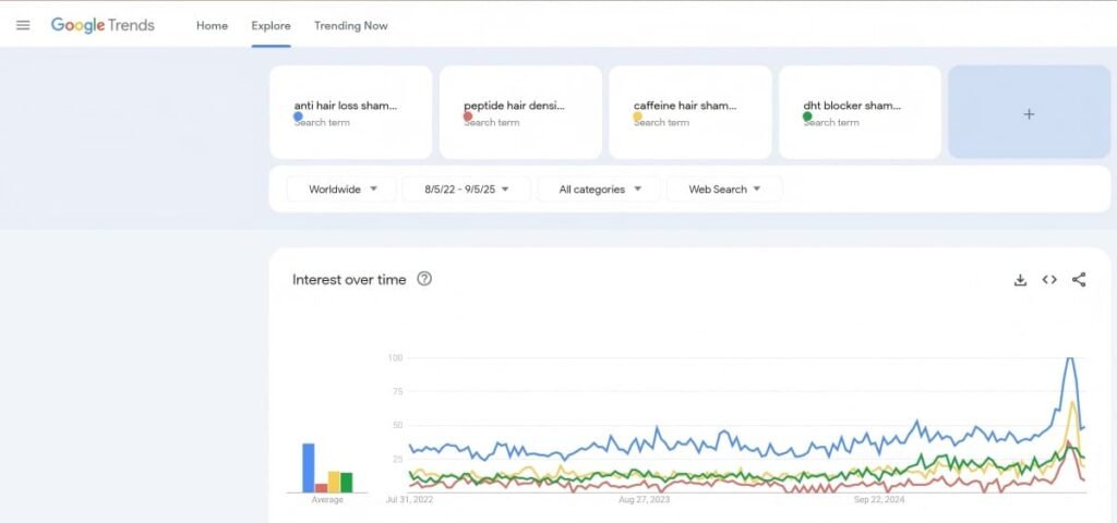 Searches skew to “anti-hair fall,” “postpartum shedding,” and “hair density serum,” while social buzz highlights rosemary and caffeine routines. Win with daily-use systems, SKU ladders, and compliance-safe copy that emphasizes reduced breakage, fuller look, and scalp comfort.