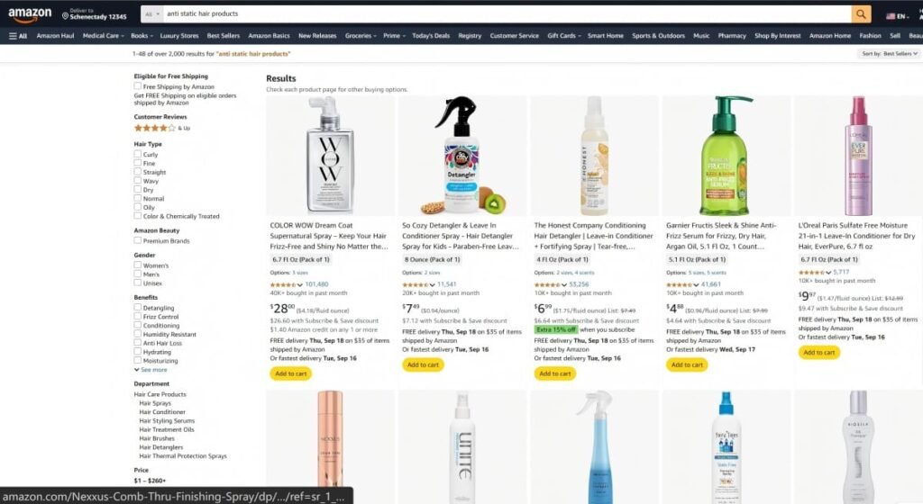 Static control sits at the intersection of seasonal need (winter, AC seasons) and on-camera grooming (video calls, content creators). Anti-humidity topcoats and frizz serums set the expectation for shine plus smoothness, while pocket mists solve day-two flyaways—prime for bundle-and-upsell strategies in e-commerce. (Amazon)