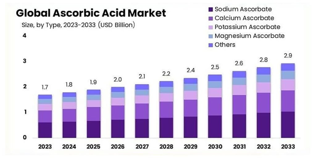 The Ascorbic Acid Market focuses on the production and distribution of Vitamin C.The Global Ascorbic Acid Market size is expected to be worth around USD 2.9 Billion by 2033, from USD 1.7 Billion in 2023, growing at a CAGR of 5.60% during the forecast period from 2024 to 2033.